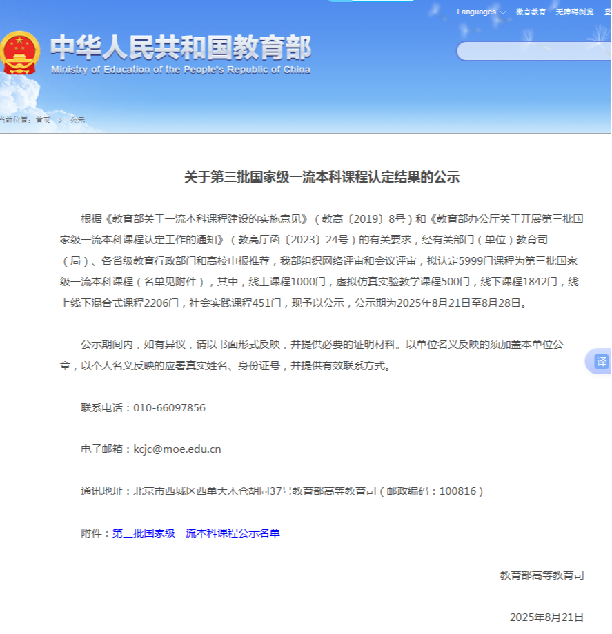 2025年8月21日,教育部高等教育司公示了“第三批国家级一流本科课程认定结果”,我校四门课程获国家级一流本科课程认定,其中线上课程1门,线上线下混合式课程1门,社会实践课程2门。