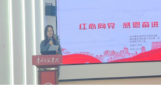 赵翠华对旅游文化学院2025年资助工作作总结,她强调,学院始终围绕“公平、公正、公开”原则,修订和完善了各项评奖制度的量化考核指标,以“精准资助、应助尽助”为目标,将每一项资助政策落到实处,让每一份温暖精准传递到需要的同学。她提出,希望大家未来能够常怀感恩之心,把受到资助的这份温暖转化为学习的动力,听党话、跟党走、感恩党,用实际行动诠释“红心向党”的信念,更希望大家未来有能力时,能将这份爱心传递下去帮助更多需要帮助的人,真正做到“感恩奋进”。